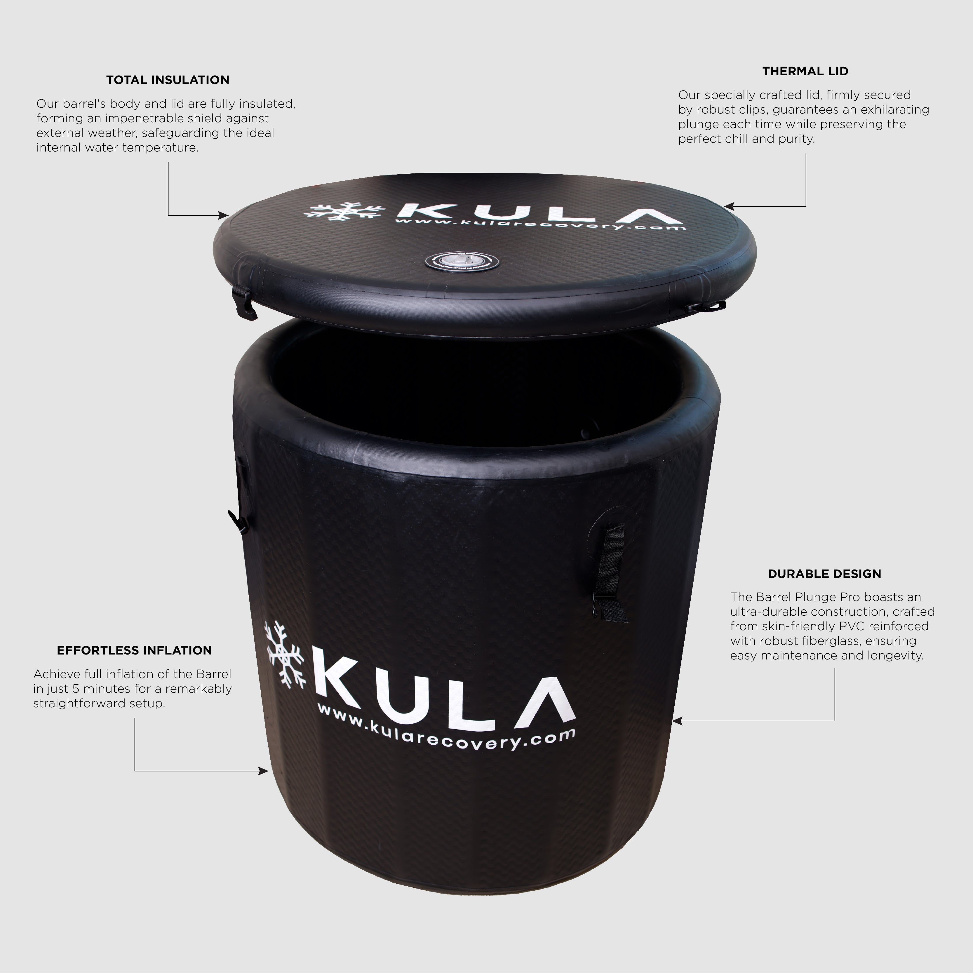 Get cold therapy on demand with the Barrel Plunge Pro. It's easy to set up and requires only water with ice or a KULA chiller. Fiberglass-reinforced, skin-friendly PVC hard walls support a solid plunge. The insulated, lockable lid keeps your water clean and cold between sessions. You can use it anywhere, including at home, in the gym, or outdoors, and also pack it into a carry bag for travel or storage. Get fast, free UAE-wide delivery, flexible Tabby payments, and a one-year warranty with local support.